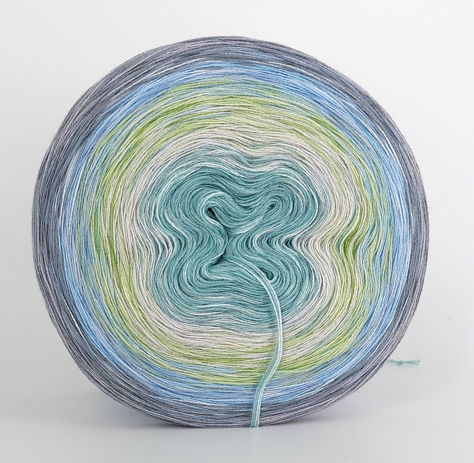 Bei der Tuchwicklung müsst ihr bei mir von innen beginnen. Hier wird jeder Farbabschnitt immer Länger, sodass die "Balken" im Tuch ungefähr gleich dick bleiben. Bei einer Normalen Wicklung sind alle Farbabschnitte gleichlang.