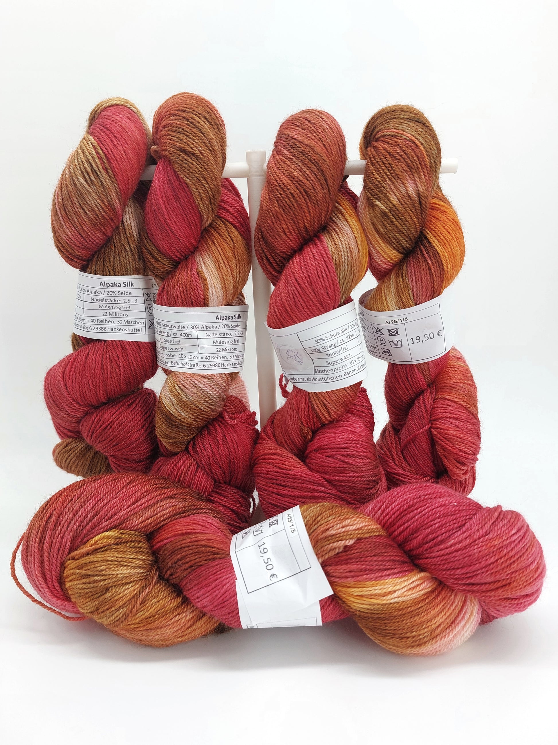 Jeder Strang ist ein Unikat und es sind immer nur 5 Stränge die zusammen gefärbt wurden, aber nur ähnlich sind nie identisch.