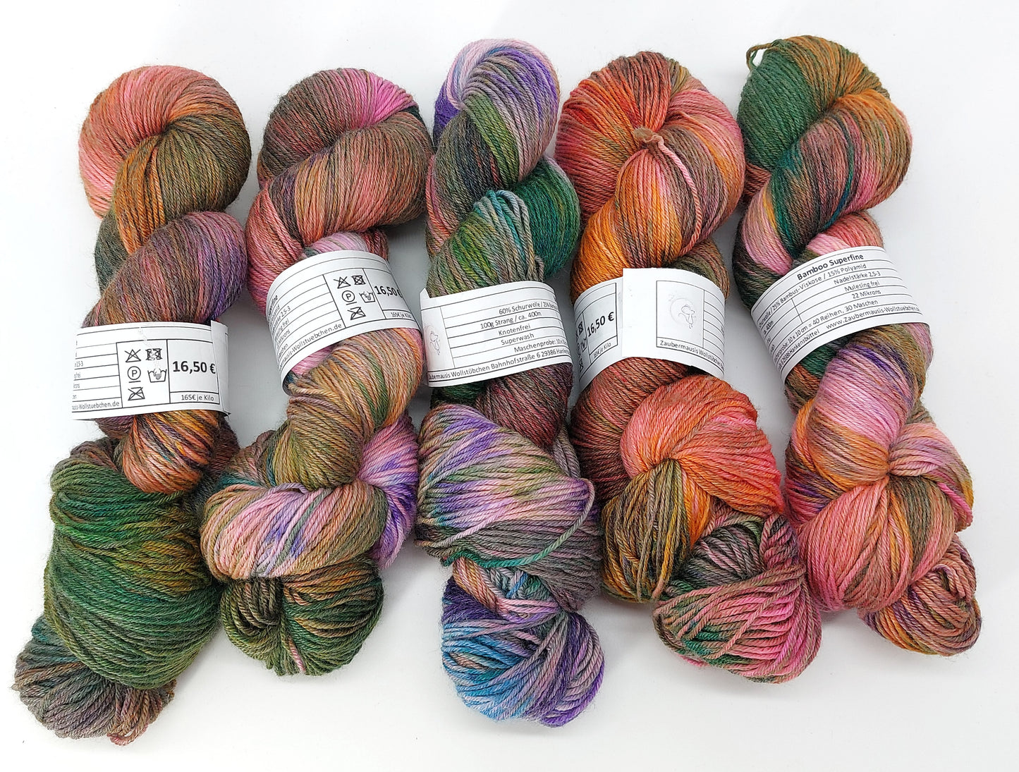 Gefärbt werden die Stränge mit Säurefarben, jeder Strang ist ein Unikat und es sind immer nur 5 Stränge die zusammen gefärbt wurden, aber nur ähnlich sind nie identisch.
