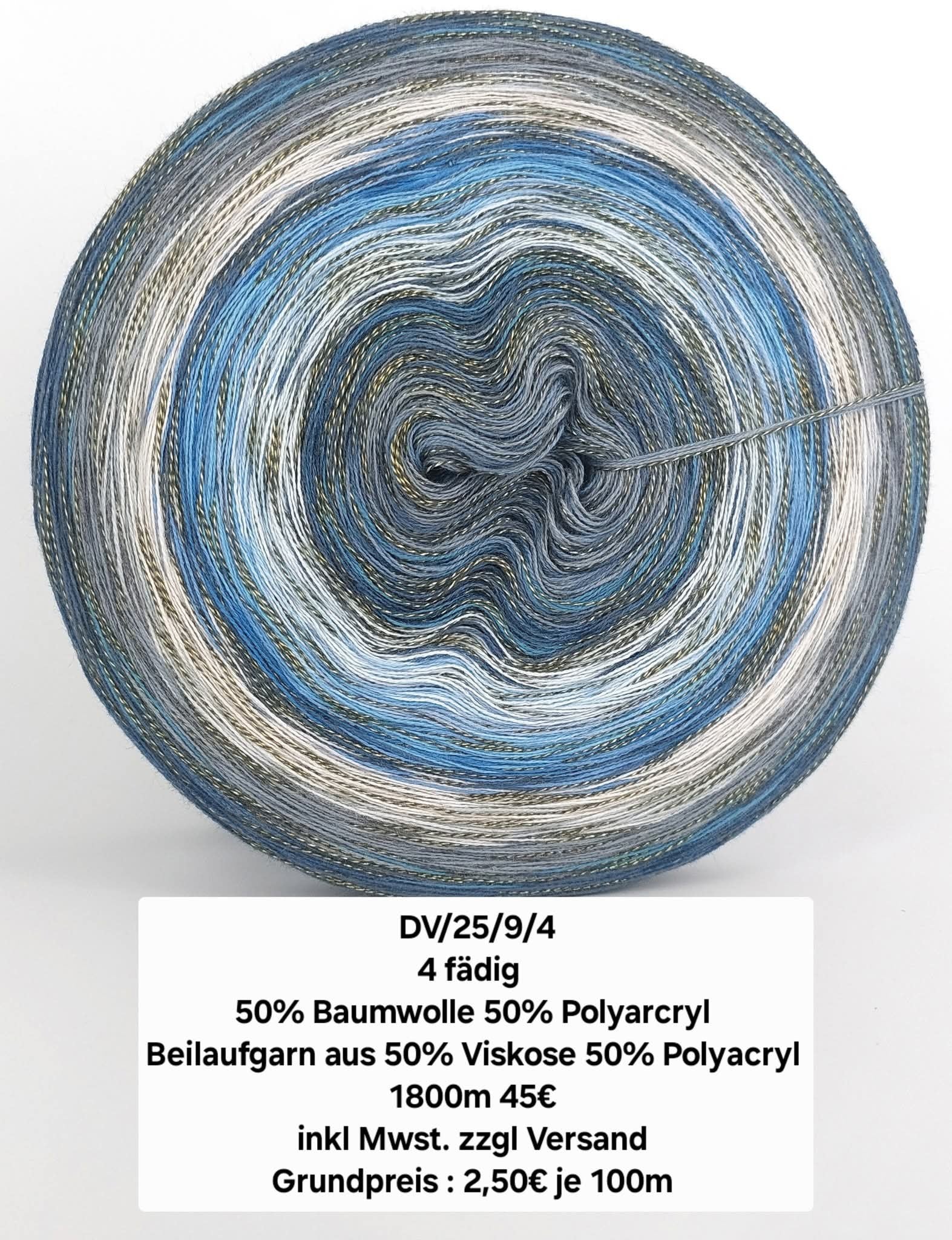 3 Fäden bestehen aus 50% Baumwolle 50% Polyacryl, 1 faden 50% Viskose 50% Polyacryl