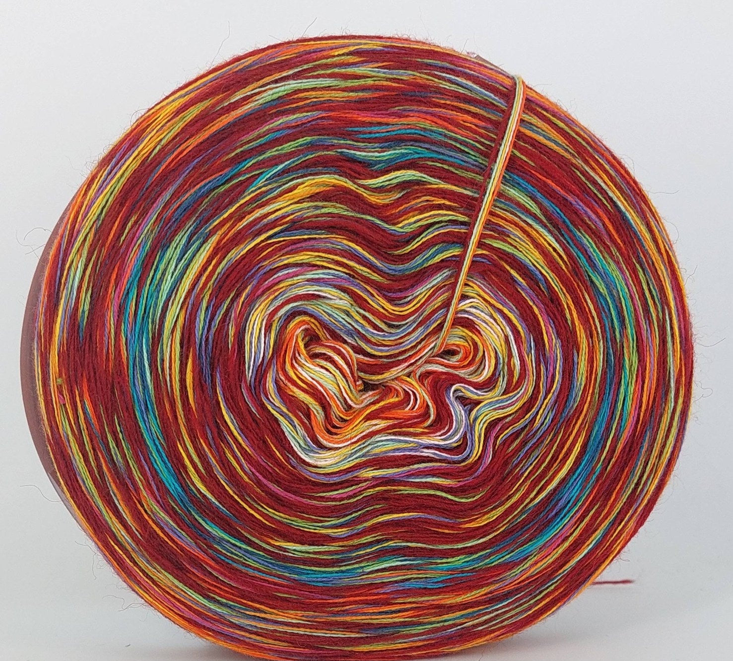 Bei der Tuchwicklung müsst ihr bei mir von innen beginnen. Hier wird jeder Farbabschnitt immer Länger, sodass die "Balken" im Tuch ungefähr gleich dick bleiben. Bei einer Normalen Wicklung sind alle Farbabschnitte gleichlang.