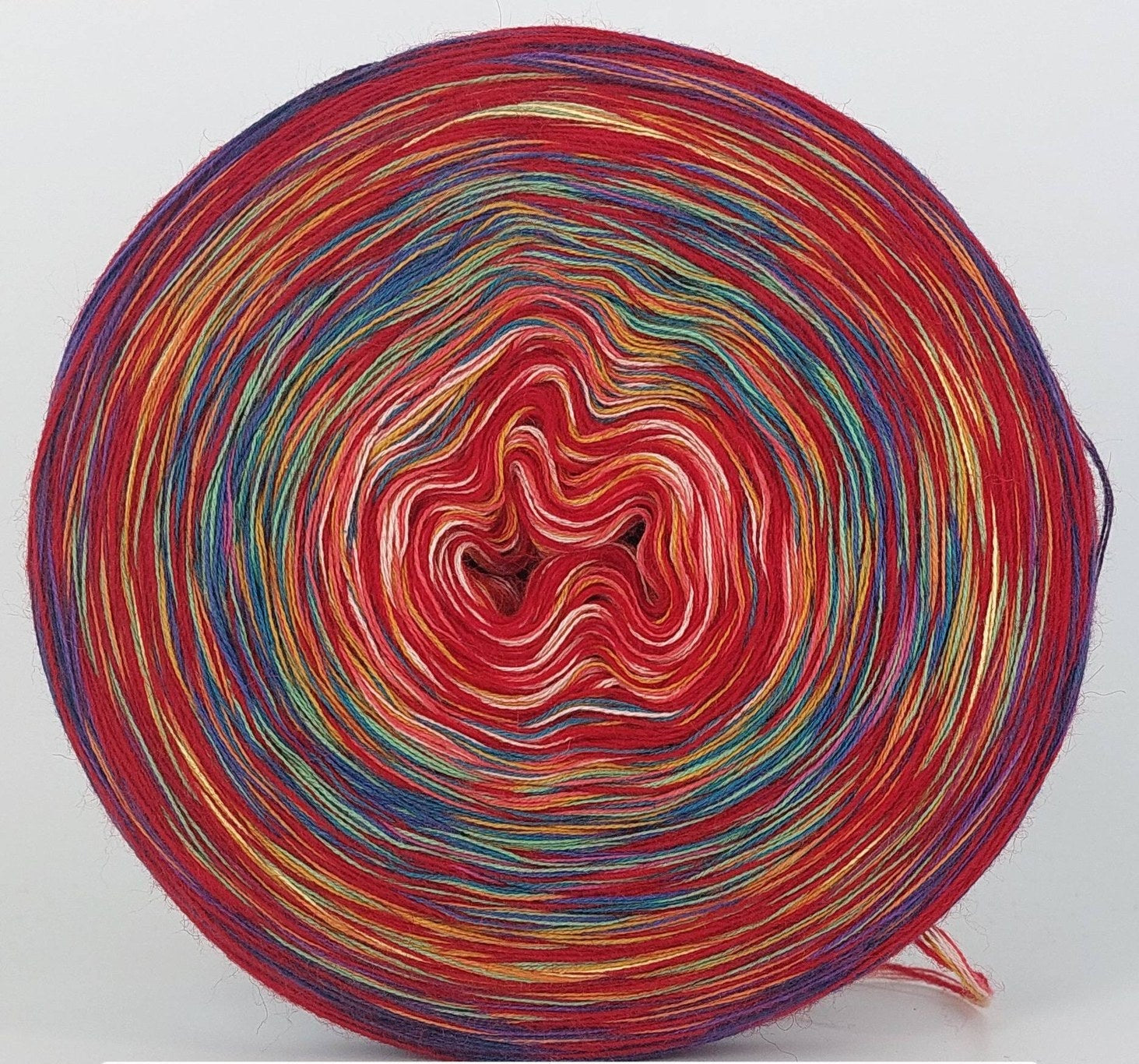 Bei der Tuchwicklung müsst ihr bei mir von innen beginnen. Hier wird jeder Farbabschnitt immer Länger, sodass die "Balken" im Tuch ungefähr gleich dick bleiben. Bei einer Normalen Wicklung sind alle Farbabschnitte gleichlang.