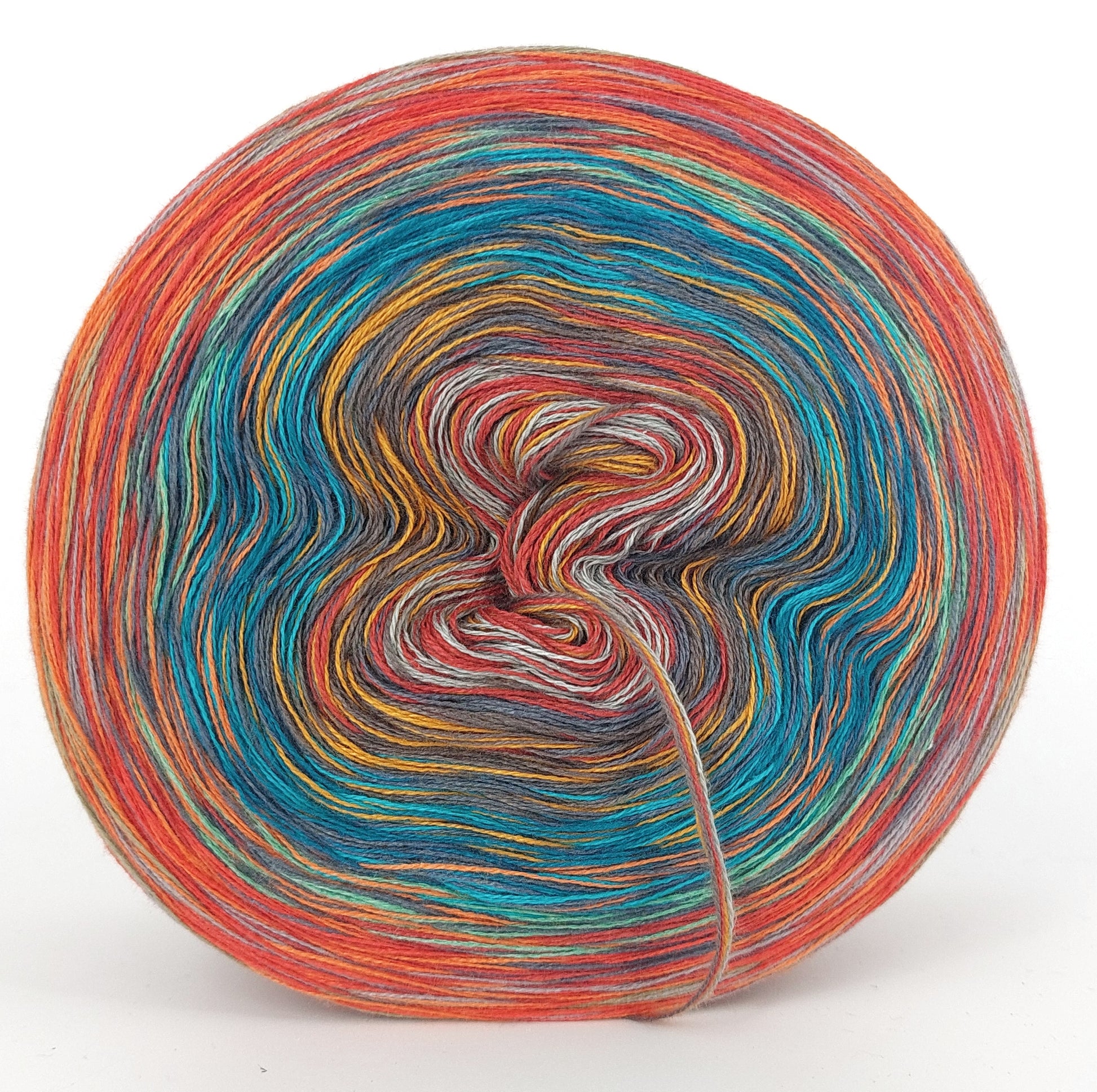 Der Bobbel besteht aus 50 % Baumwolle und 50 % Polyacryl und sind durch die Farbübergänge mit kleinen Knoten ( Frankfurter Knoten ) verbunden, die super sicher sind und kaum spürbar. Es wechselt immer nur 1 Faden von den 4 gefachten Fäden. Das Garn ist gefacht und nicht verdreht.