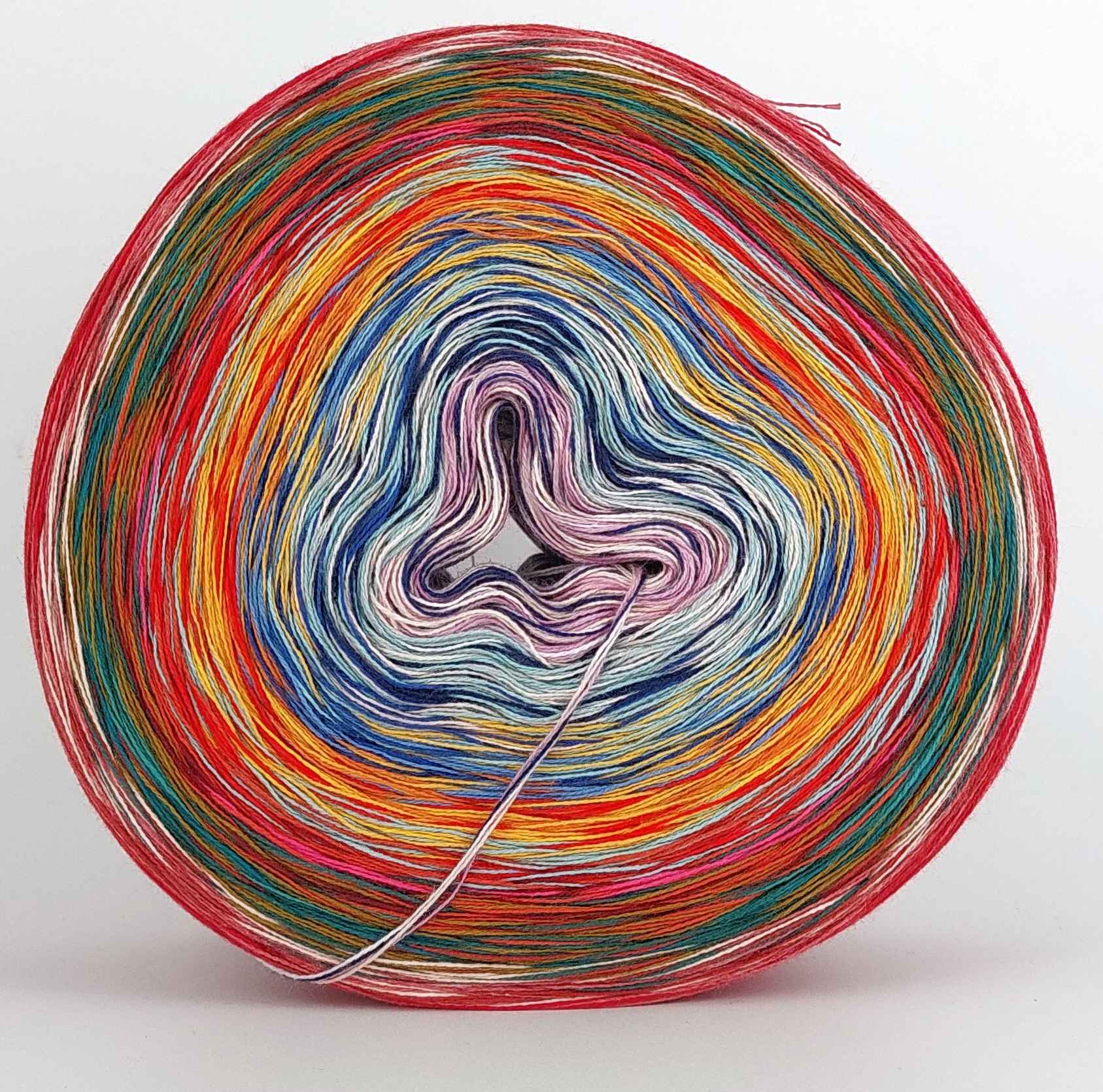 Bei der Tuchwicklung müsst ihr bei mir von innen beginnen. Hier wird jeder Farbabschnitt immer Länger, sodass die "Balken" im Tuch ungefähr gleich dick bleiben. Bei einer Normalen Wicklung sind alle Farbabschnitte gleichlang.