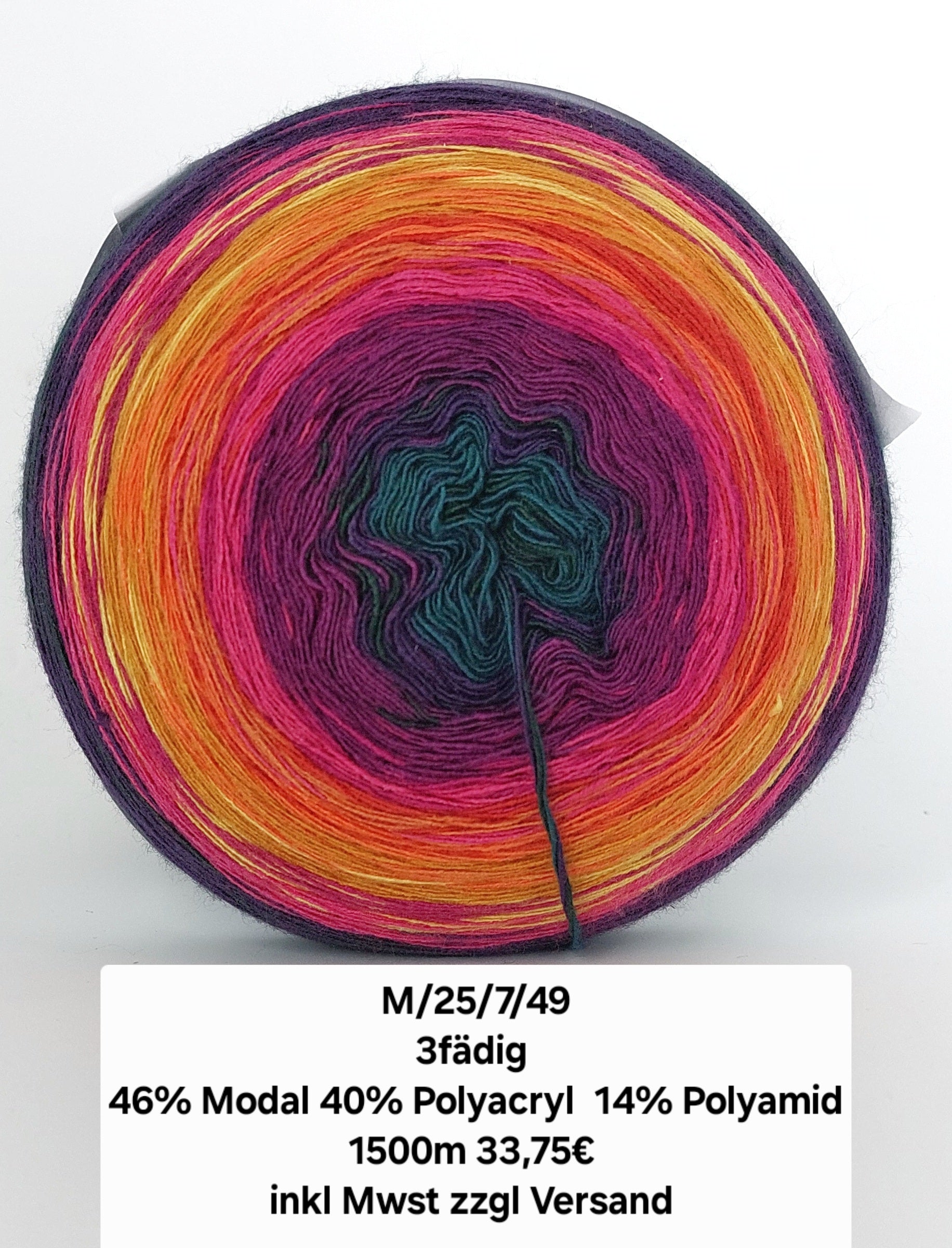 Der Bobbel ist bei den Farbübergängen mit kleinen Knoten (Frankfurter Knoten) verbunden, die super sicher sind und kaum spürbar. Es wechselt immer nur 1 Faden von den 3 gefachten Fäden. Das Garn ist gefacht und nicht verzwirnt.