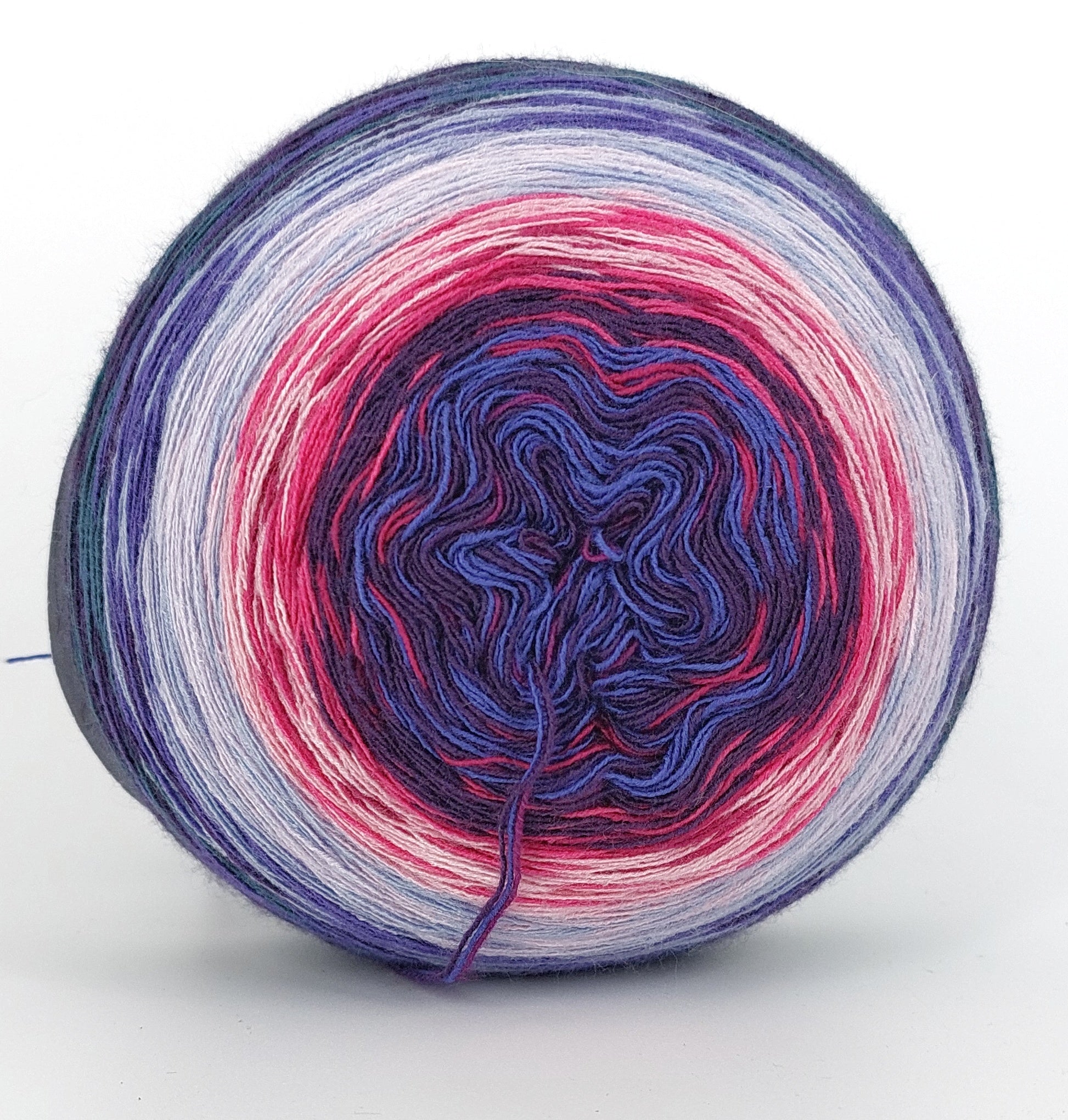 Bei der Tuchwicklung müsst ihr bei mir von innen beginnen. Hier wird jeder Farbabschnitt immer Länger, sodass die "Balken" im Tuch ungefähr gleich dick bleiben. Bei einer Normalen Wicklung sind alle Farbabschnitte gleichlang.