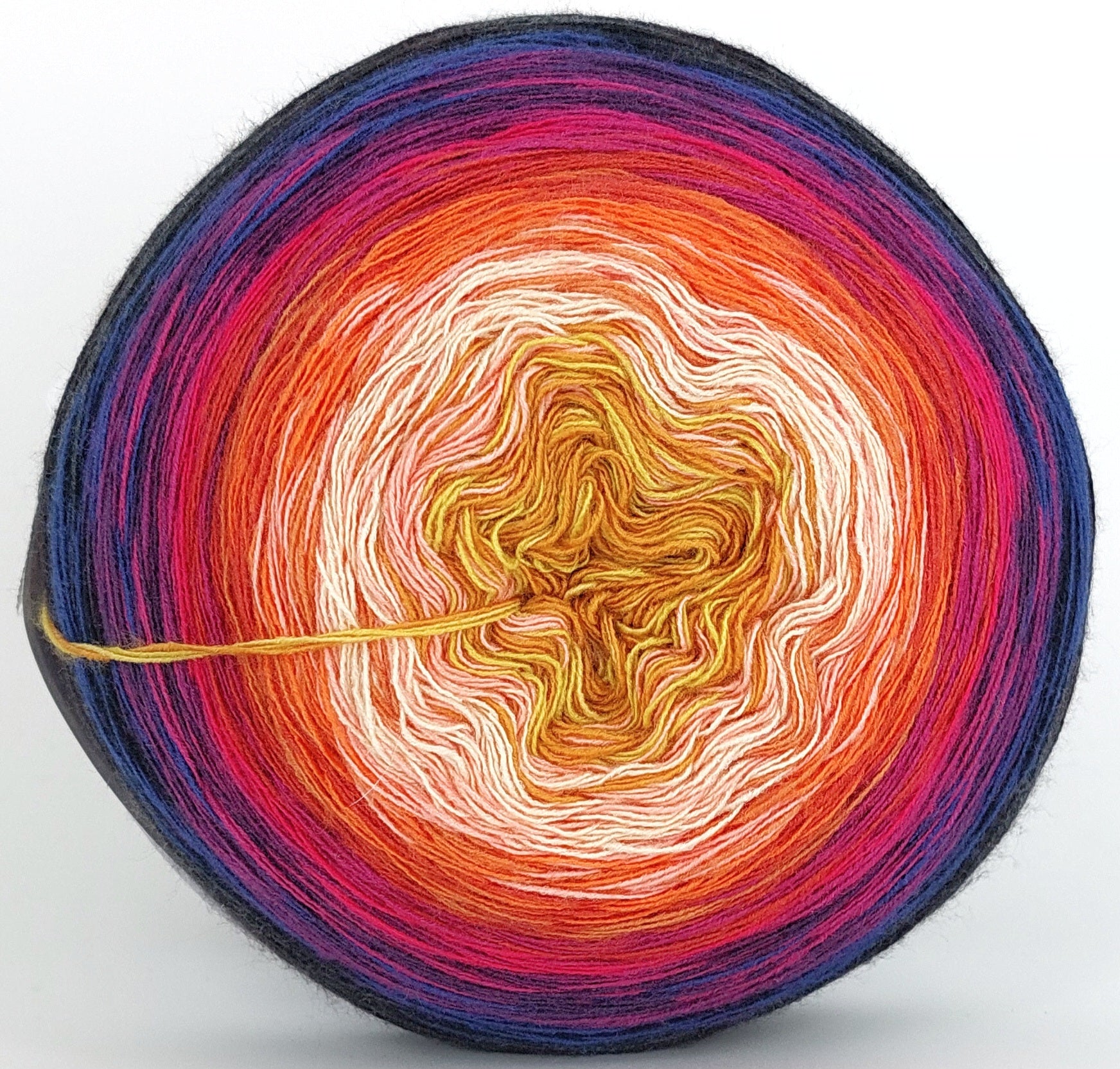 Bei der Tuchwicklung müsst ihr bei mir von innen beginnen. Hier wird jeder Farbabschnitt immer Länger, sodass die "Balken" im Tuch ungefähr gleich dick bleiben. Bei einer Normalen Wicklung sind alle Farbabschnitte gleichlang.