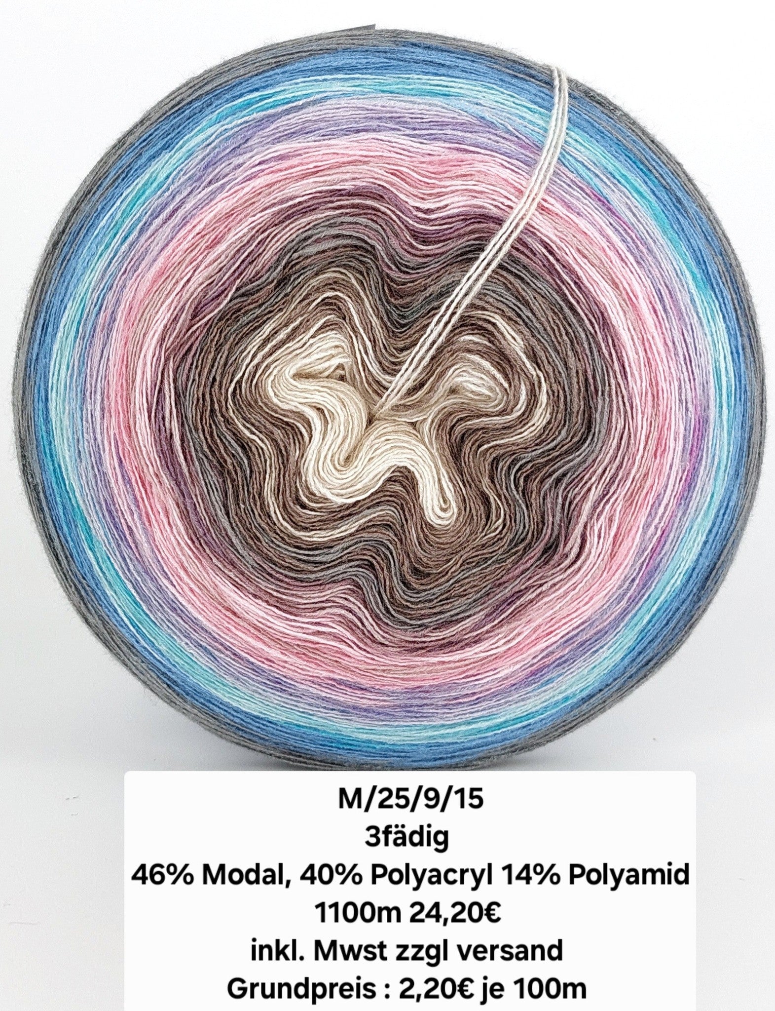 Der Bobbel ist bei den Farbübergängen mit kleinen Knoten (Frankfurter Knoten) verbunden, die super sicher sind und kaum spürbar. Es wechselt immer nur 1 Faden von den 3 gefachten Fäden. Das Garn ist gefacht und nicht verzwirnt.