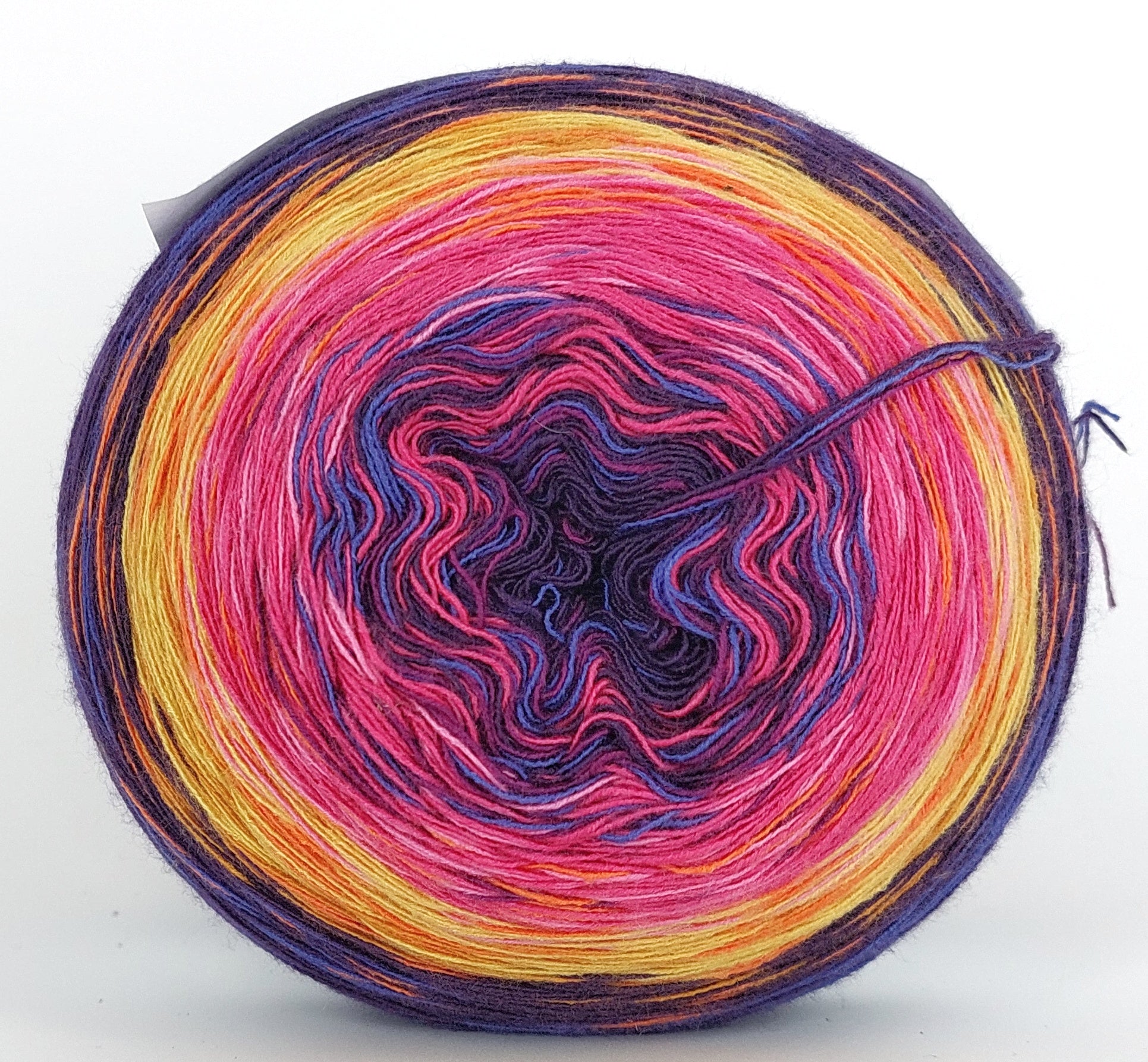 Bei der Tuchwicklung müsst ihr bei mir von innen beginnen. Hier wird jeder Farbabschnitt immer Länger, sodass die "Balken" im Tuch ungefähr gleich dick bleiben. Bei einer Normalen Wicklung sind alle Farbabschnitte gleichlang.