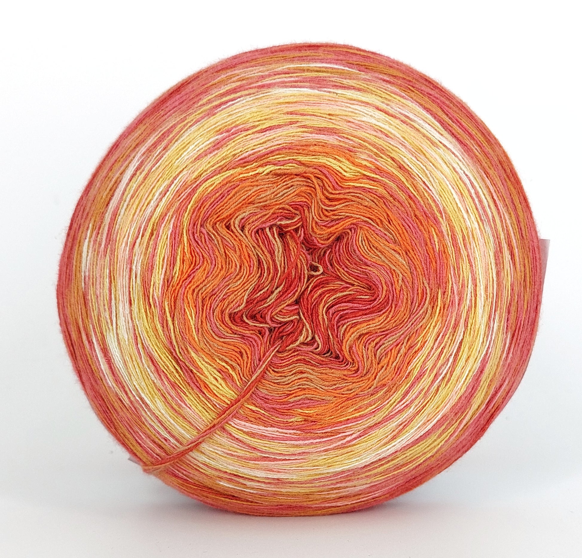 Bei der Tuchwicklung müsst ihr bei mir von innen beginnen. Hier wird jeder Farbabschnitt immer Länger, sodass die "Balken" im Tuch ungefähr gleich dick bleiben. Bei einer Normalen Wicklung sind alle Farbabschnitte gleichlang.