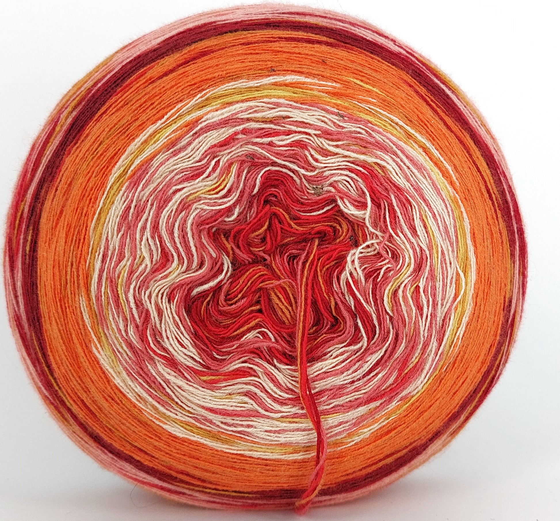 Bei der Tuchwicklung müsst ihr bei mir von innen beginnen. Hier wird jeder Farbabschnitt immer Länger, sodass die "Balken" im Tuch ungefähr gleich dick bleiben. Bei einer Normalen Wicklung sind alle Farbabschnitte gleichlang.