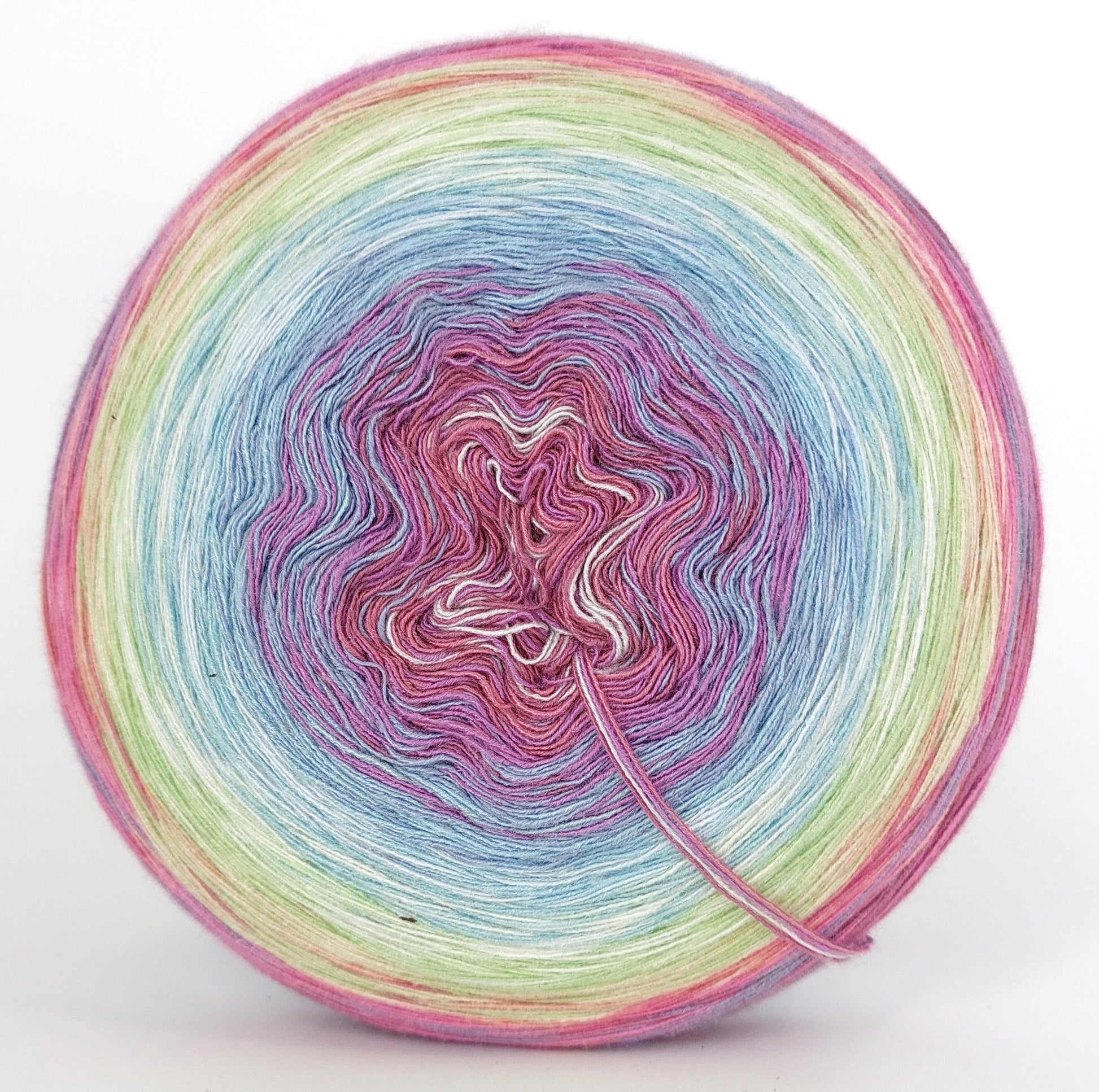 Bei der Tuchwicklung müsst ihr bei mir von innen beginnen. Hier wird jeder Farbabschnitt immer Länger, sodass die "Balken" im Tuch ungefähr gleich dick bleiben. Bei einer Normalen Wicklung sind alle Farbabschnitte gleichlang.