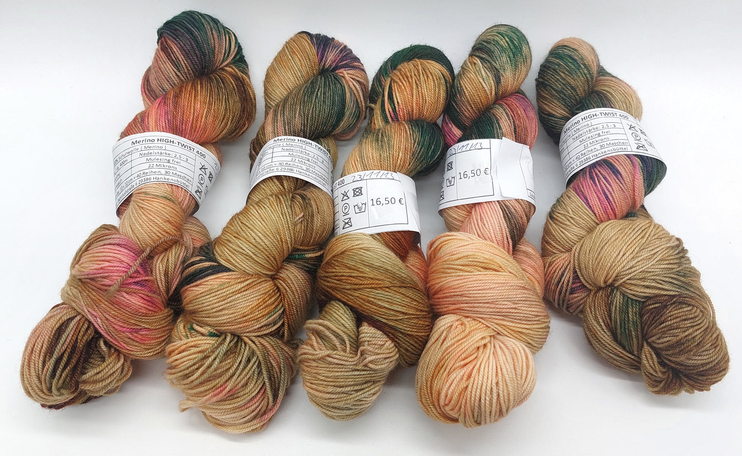 Gefärbt werden die Stränge mit Säurefarben, jeder Strang ist ein Unikat und es sind immer nur 5 Stränge die zusammen gefärbt wurden, aber nur ähnlich nie identisch sind.