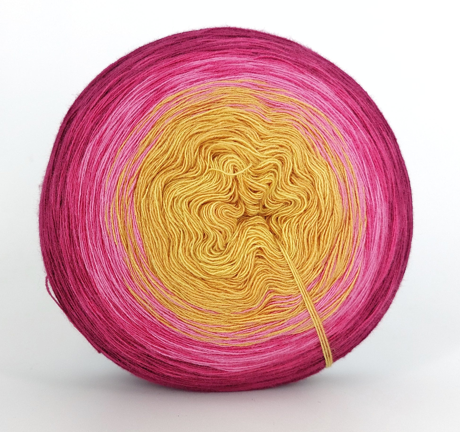 Bei der Tuchwicklung müsst ihr bei mir von innen beginnen. Hier wird jeder Farbabschnitt immer Länger, sodass die "Balken" im Tuch ungefähr gleich dick bleiben. Bei einer Normalen Wicklung sind alle Farbabschnitte gleichlang.