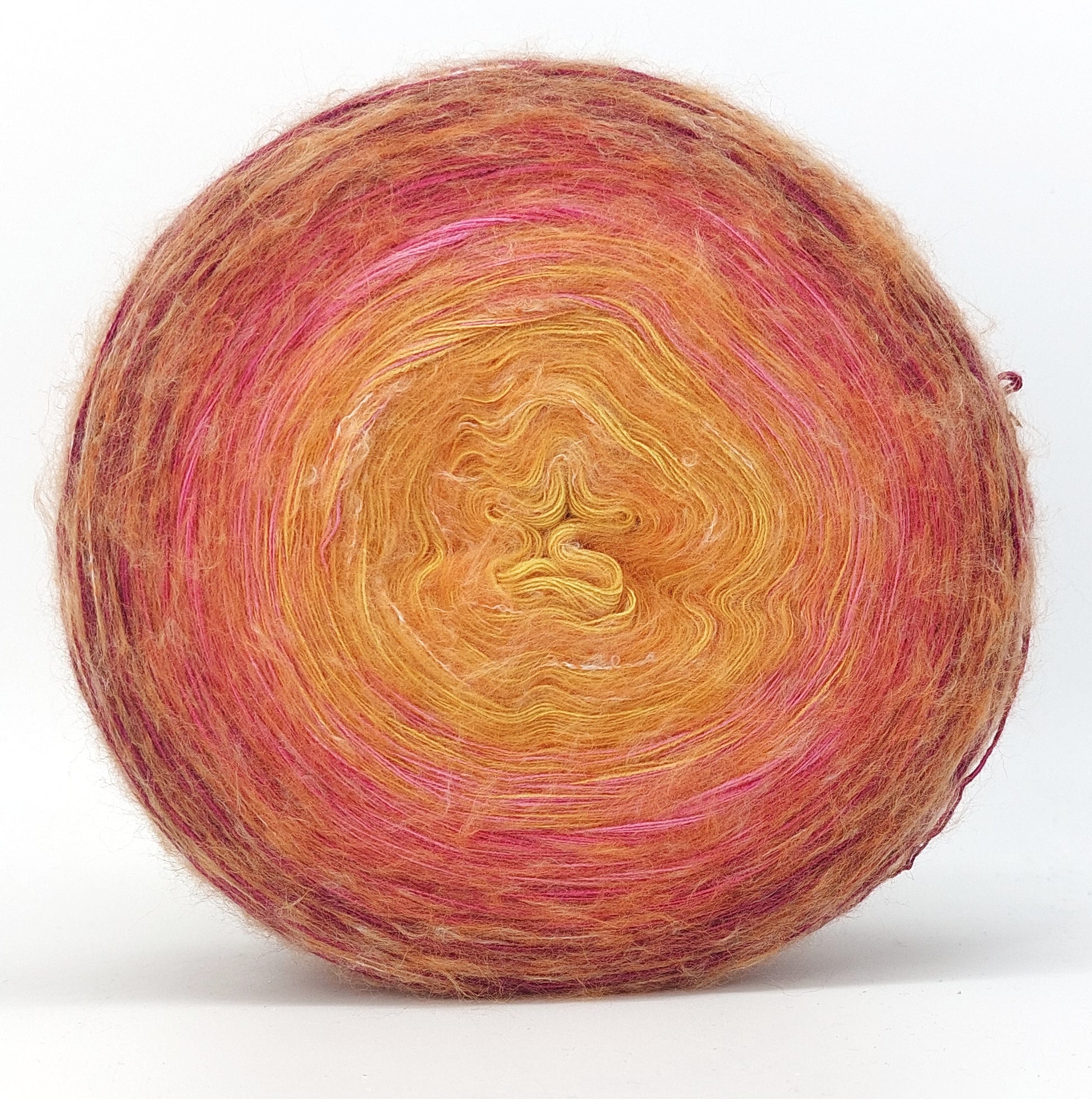 Der Bobbel besteht aus 50 % Baumwolle und 50 % Polyacryl und sind durch die Farbübergänge mit kleinen Knoten ( Frankfurter Knoten ) verbunden, die super sicher sind und kaum spürbar. Es wechselt immer nur 1 Faden von den 4 gefachten Fäden. Das Garn ist gefacht und nicht verdreht.