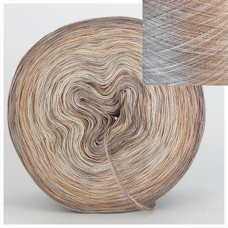 Der Bobbel besteht aus 3fäden 50 % Baumwolle und 50 % Polyacryl + 1 Faden 100% Biobaumwolle und sind durch die Farbübergänge mit kleinen Knoten ( Frankfurter Knoten ) verbunden, die super sicher sind und kaum spürbar. Es wechselt immer nur 1 Faden von den 4 gefachten Fäden. Das Garn ist gefacht und nicht verdreht.