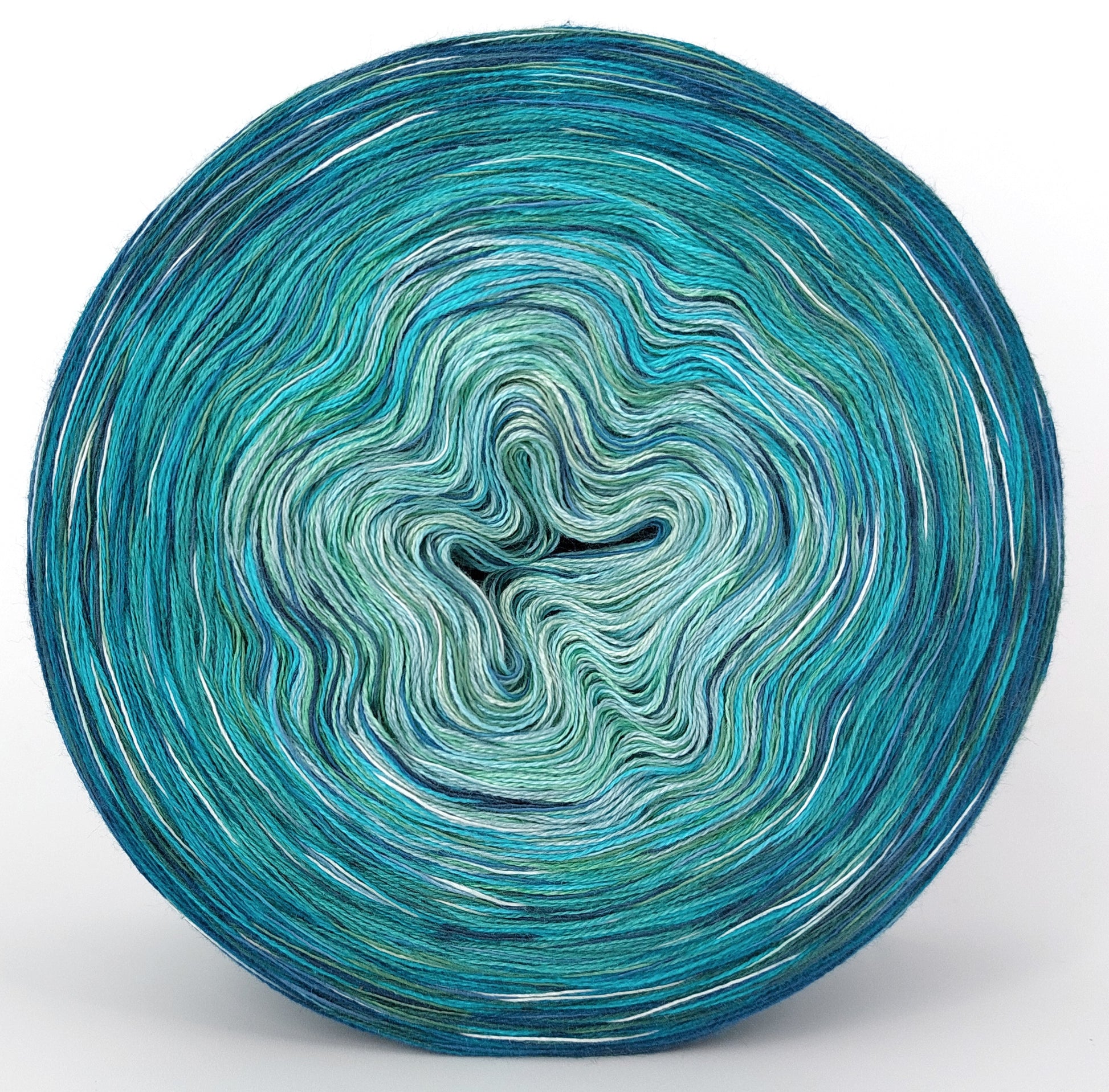 Der Bobbel besteht aus 3fäden 50 % Baumwolle und 50 % Polyacryl + 1 Faden 100% Biobaumwolle und sind durch die Farbübergänge mit kleinen Knoten ( Frankfurter Knoten ) verbunden, die super sicher sind und kaum spürbar. Es wechselt immer nur 1 Faden von den 4 gefachten Fäden. Das Garn ist gefacht und nicht verdreht.