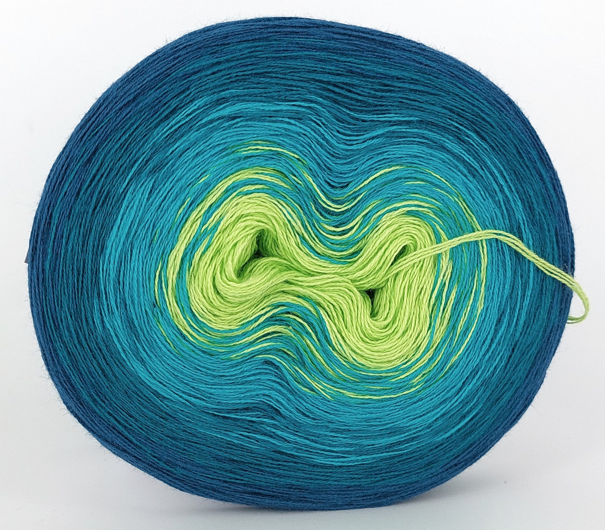 Bei der Tuchwicklung müsst ihr bei mir von innen beginnen. Hier wird jeder Farbabschnitt immer Länger, sodass die "Balken" im Tuch ungefähr gleich dick bleiben. Bei einer Normalen Wicklung sind alle Farbabschnitte gleichlang.