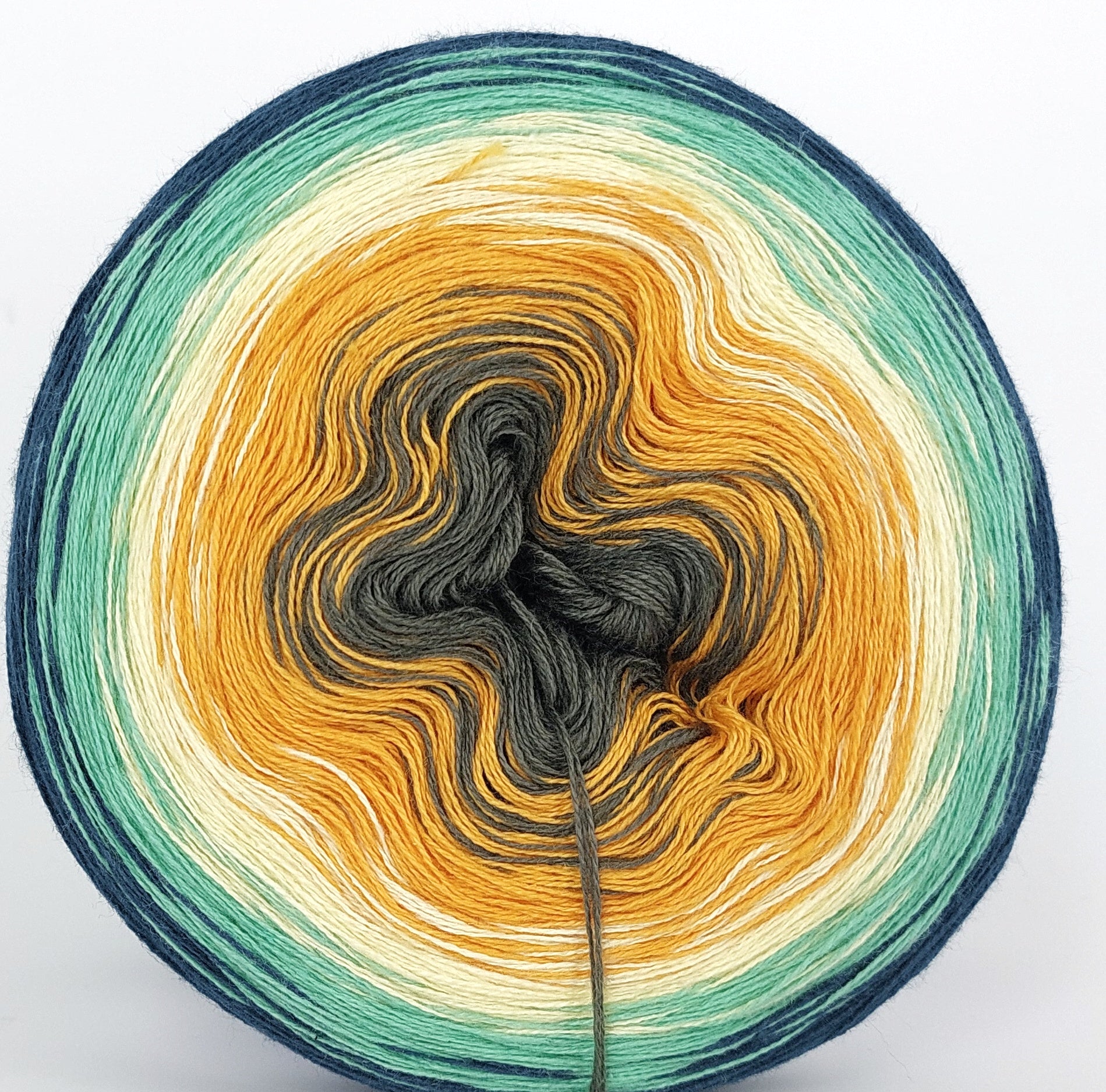 Bei der Tuchwicklung müsst ihr bei mir von innen beginnen. Hier wird jeder Farbabschnitt immer Länger, sodass die "Balken" im Tuch ungefähr gleich dick bleiben. Bei einer Normalen Wicklung sind alle Farbabschnitte gleichlang.