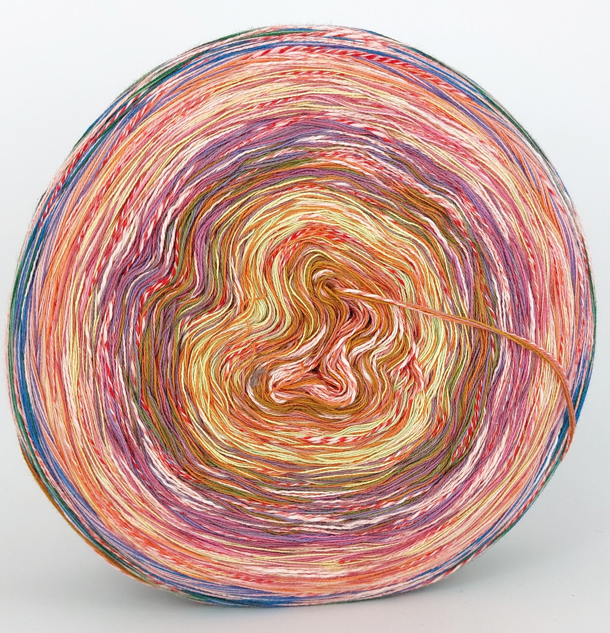 Der Bobbel ist bei den Farbübergängen mit kleinen Knoten (Frankfurter Knoten) verbunden, die super sicher sind und kaum spürbar. Es wechselt immer nur 1 Faden von den 4 gefachten Fäden. Das Garn ist gefacht und nicht verzwirnt.