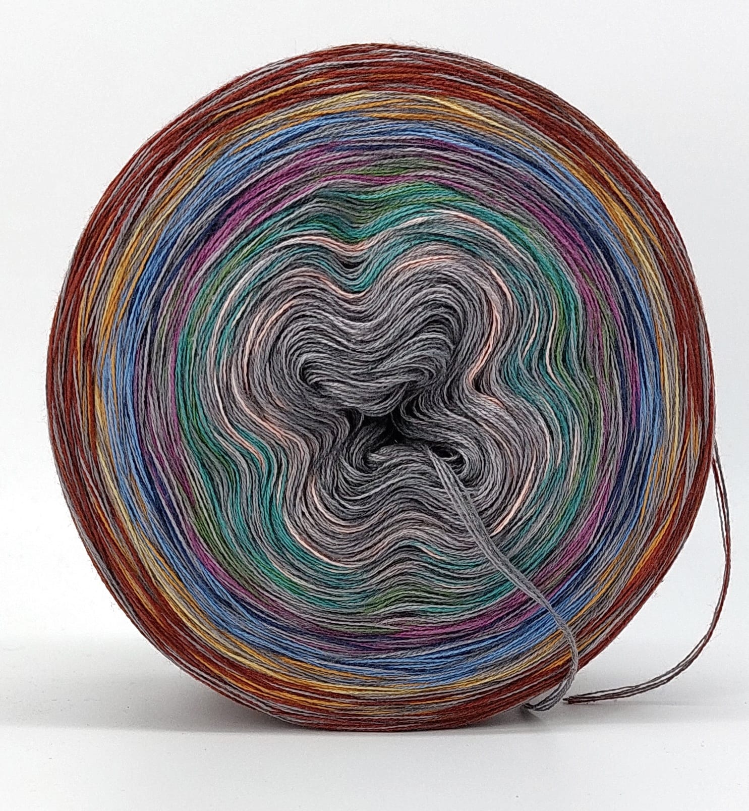 Bei der Tuchwicklung müsst ihr bei mir von innen beginnen. Hier wird jeder Farbabschnitt immer Länger, sodass die "Balken" im Tuch ungefähr gleich dick bleiben. Bei einer Normalen Wicklung sind alle Farbabschnitte gleichlang.