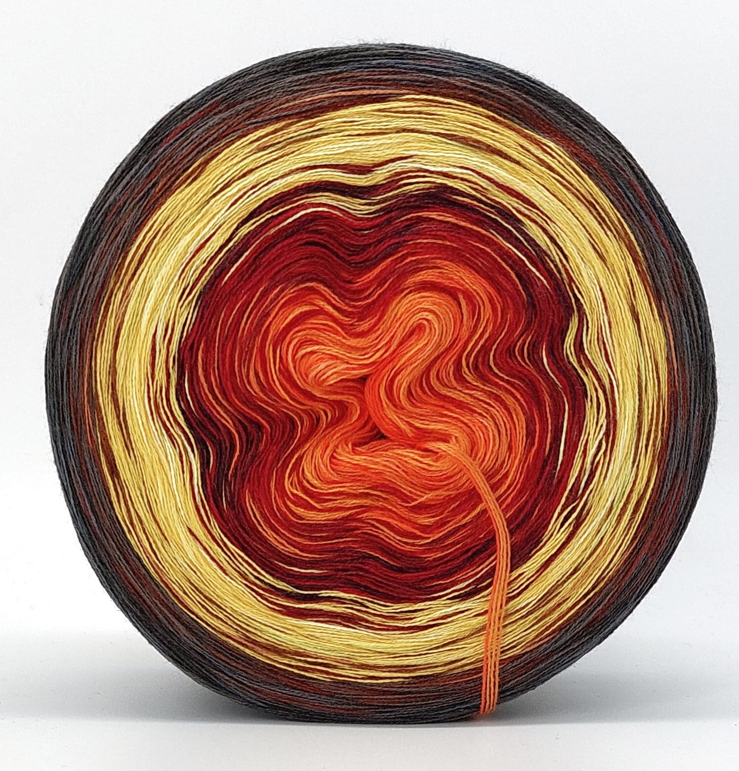 Bei der Tuchwicklung müsst ihr bei mir von innen beginnen. Hier wird jeder Farbabschnitt immer Länger, sodass die "Balken" im Tuch ungefähr gleich dick bleiben. Bei einer Normalen Wicklung sind alle Farbabschnitte gleichlang.
