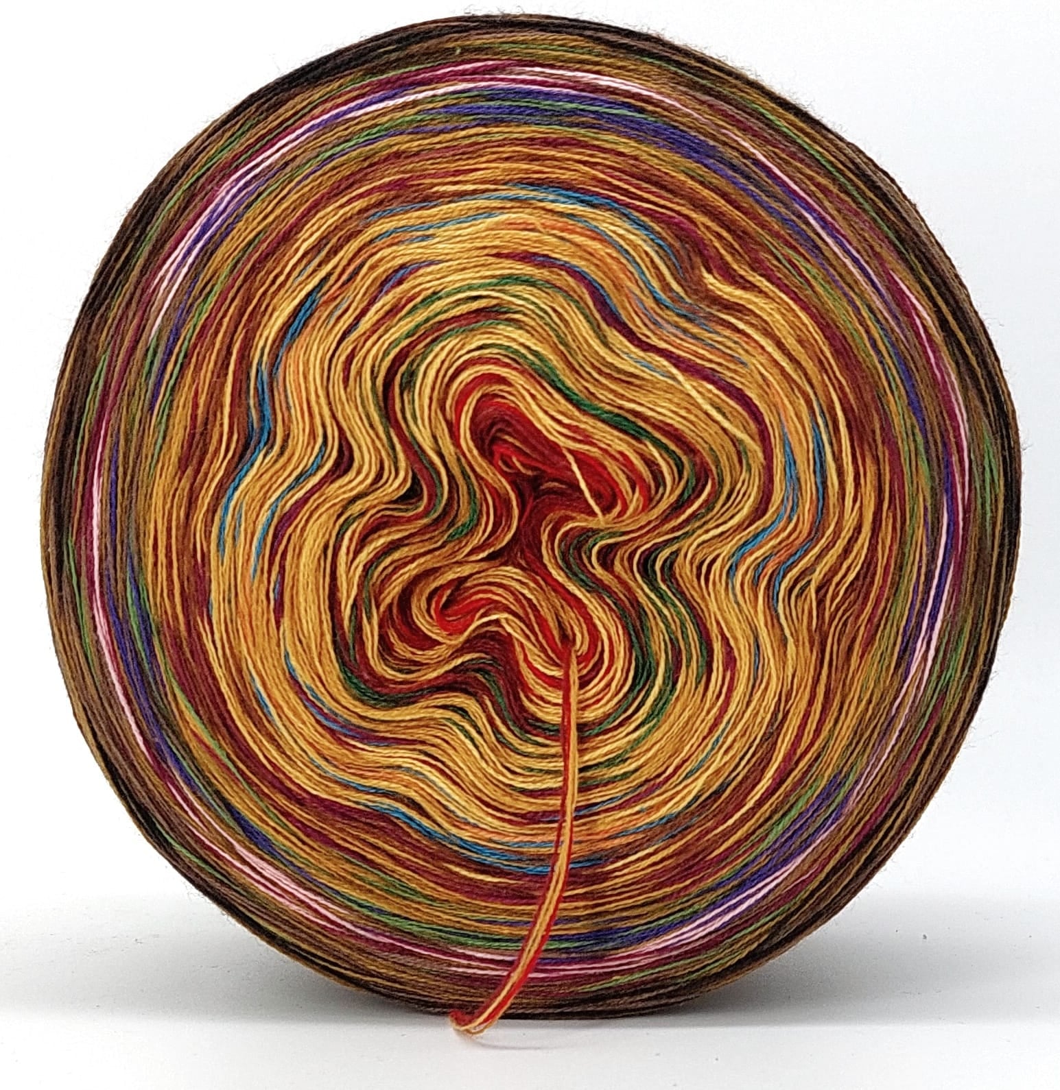 Bei der Tuchwicklung müsst ihr bei mir von innen beginnen. Hier wird jeder Farbabschnitt immer Länger, sodass die "Balken" im Tuch ungefähr gleich dick bleiben. Bei einer Normalen Wicklung sind alle Farbabschnitte gleichlang.