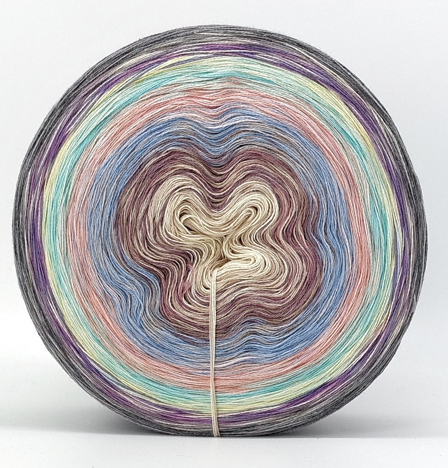 Bei der Tuchwicklung müsst ihr bei mir von innen beginnen. Hier wird jeder Farbabschnitt immer Länger, sodass die "Balken" im Tuch ungefähr gleich dick bleiben. Bei einer Normalen Wicklung sind alle Farbabschnitte gleichlang.
