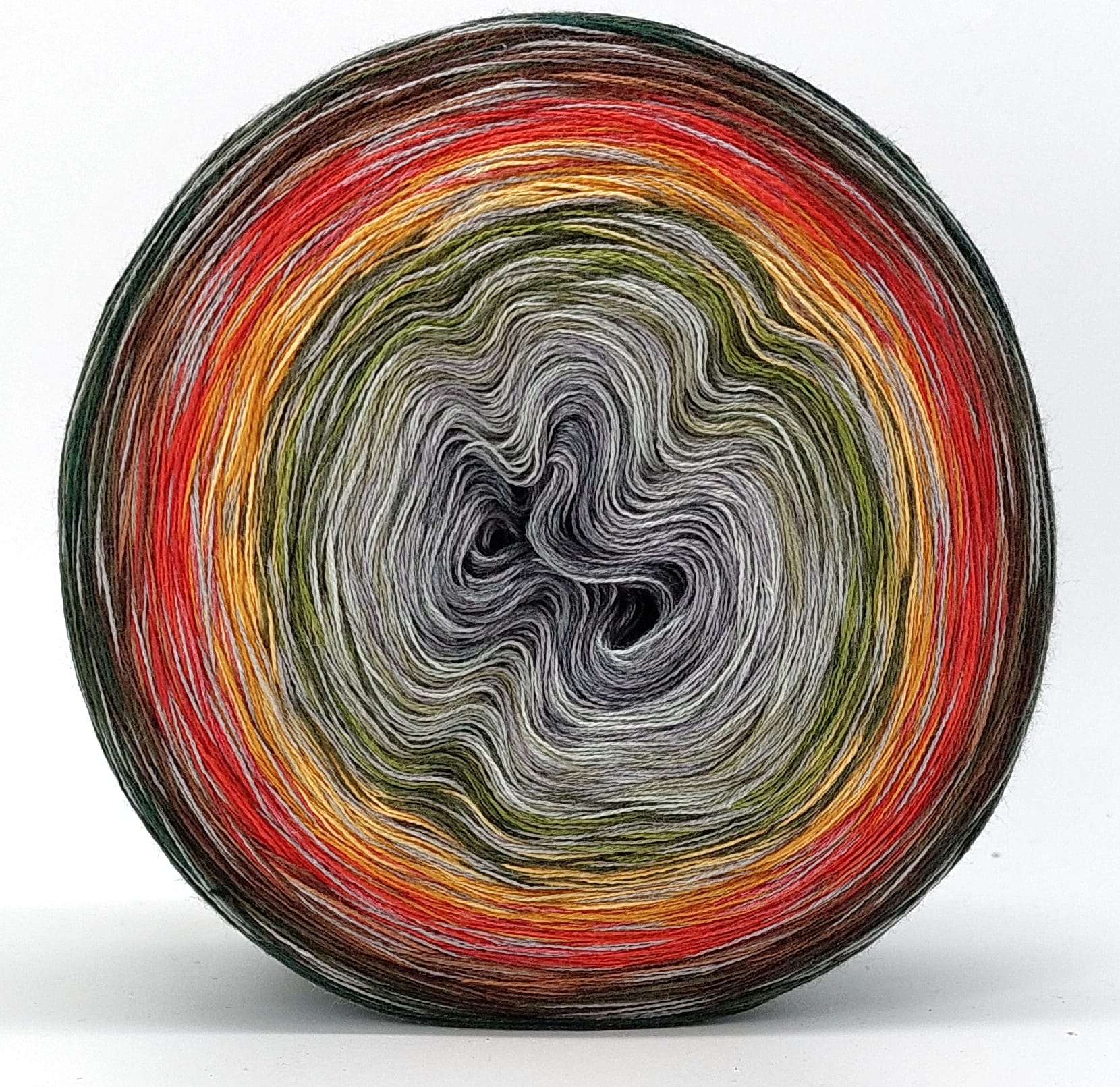 Bei der Tuchwicklung müsst ihr bei mir von innen beginnen. Hier wird jeder Farbabschnitt immer Länger, sodass die "Balken" im Tuch ungefähr gleich dick bleiben. Bei einer Normalen Wicklung sind alle Farbabschnitte gleichlang.