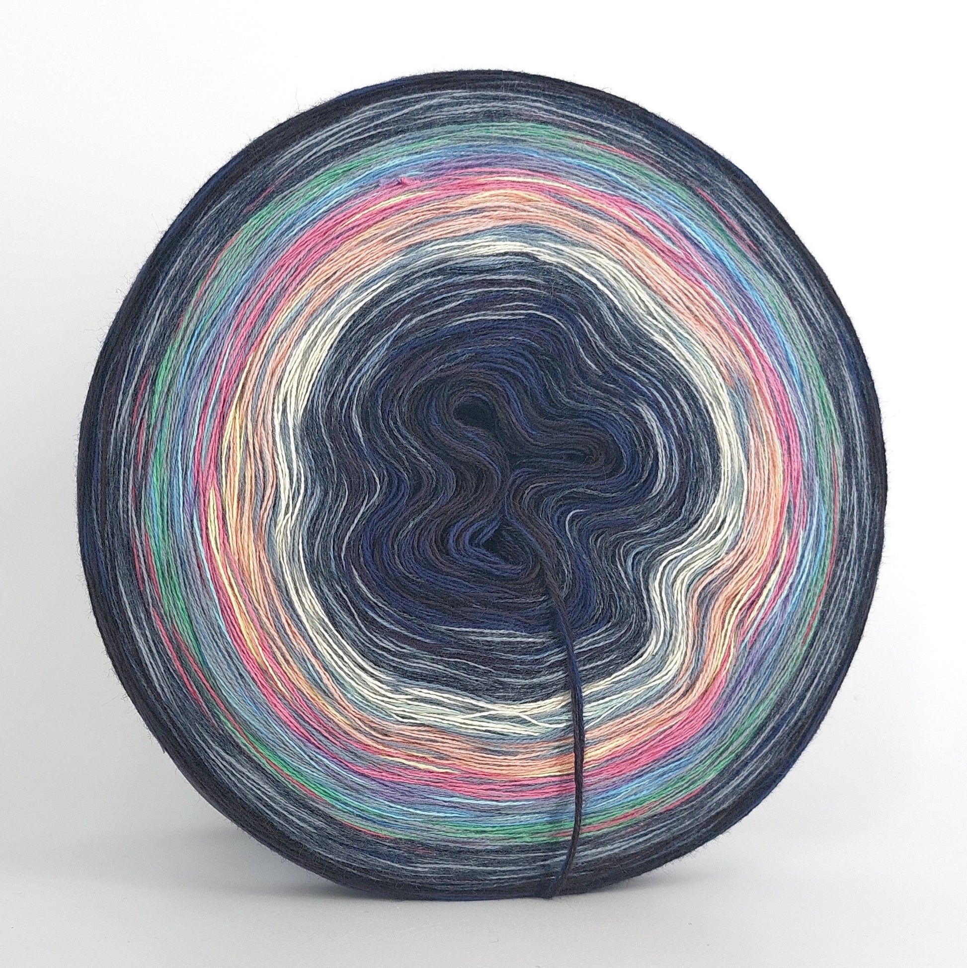 Der Bobbel ist bei den Farbübergängen mit kleinen Knoten (Frankfurter Knoten) verbunden, die super sicher sind und kaum spürbar. Es wechselt immer nur 1 Faden von den 4 gefachten Fäden. Das Garn ist gefacht und nicht verzwirnt.