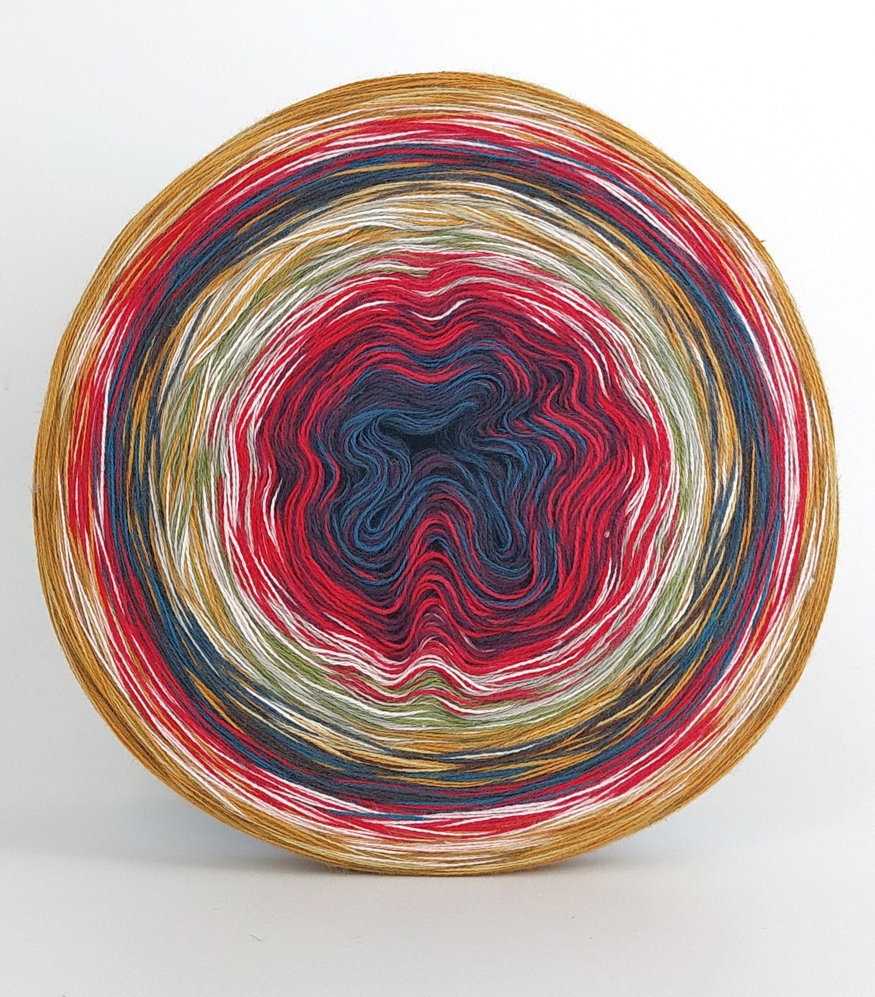 Bei der Tuchwicklung müsst ihr bei mir von innen beginnen. Hier wird jeder Farbabschnitt immer Länger, sodass die "Balken" im Tuch ungefähr gleich dick bleiben. Bei einer Normalen Wicklung sind alle Farbabschnitte gleichlang.