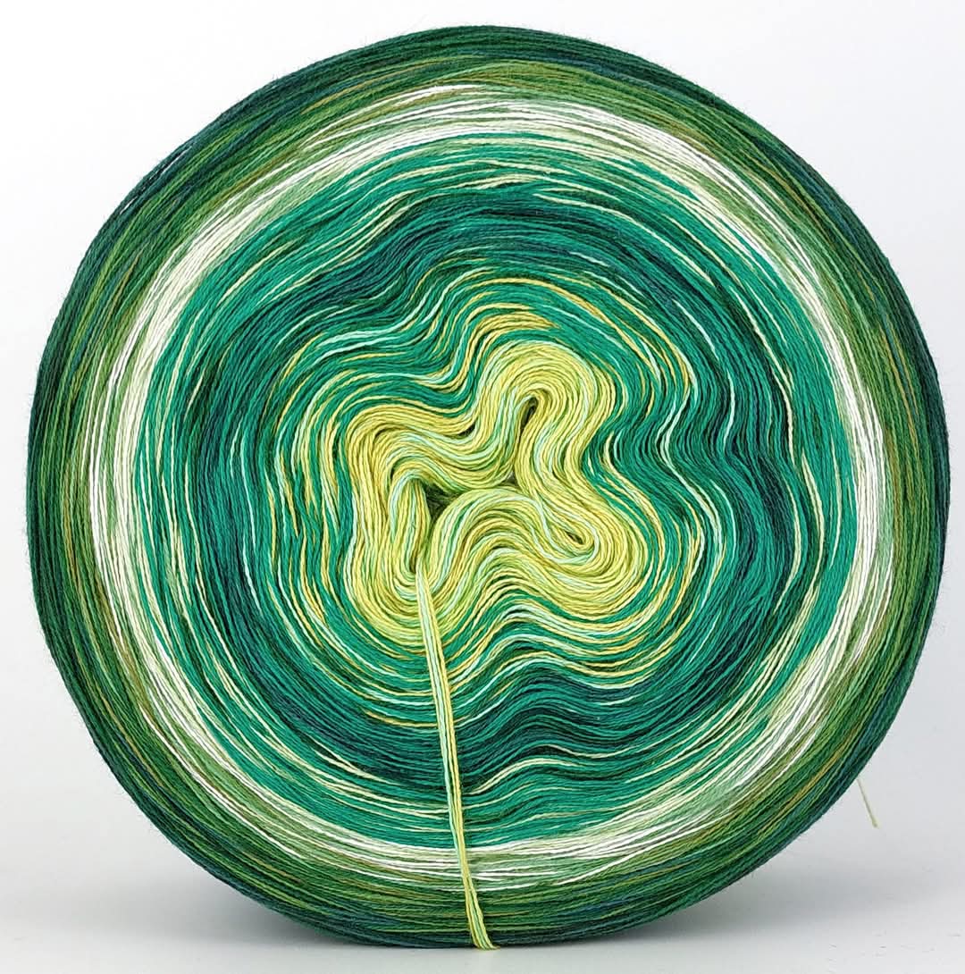 Der Bobbel ist bei den Farbübergängen mit kleinen Knoten (Frankfurter Knoten) verbunden, die super sicher sind und kaum spürbar. Es wechselt immer nur 1 Faden von den 4 gefachten Fäden. Das Garn ist gefacht und nicht verzwirnt.