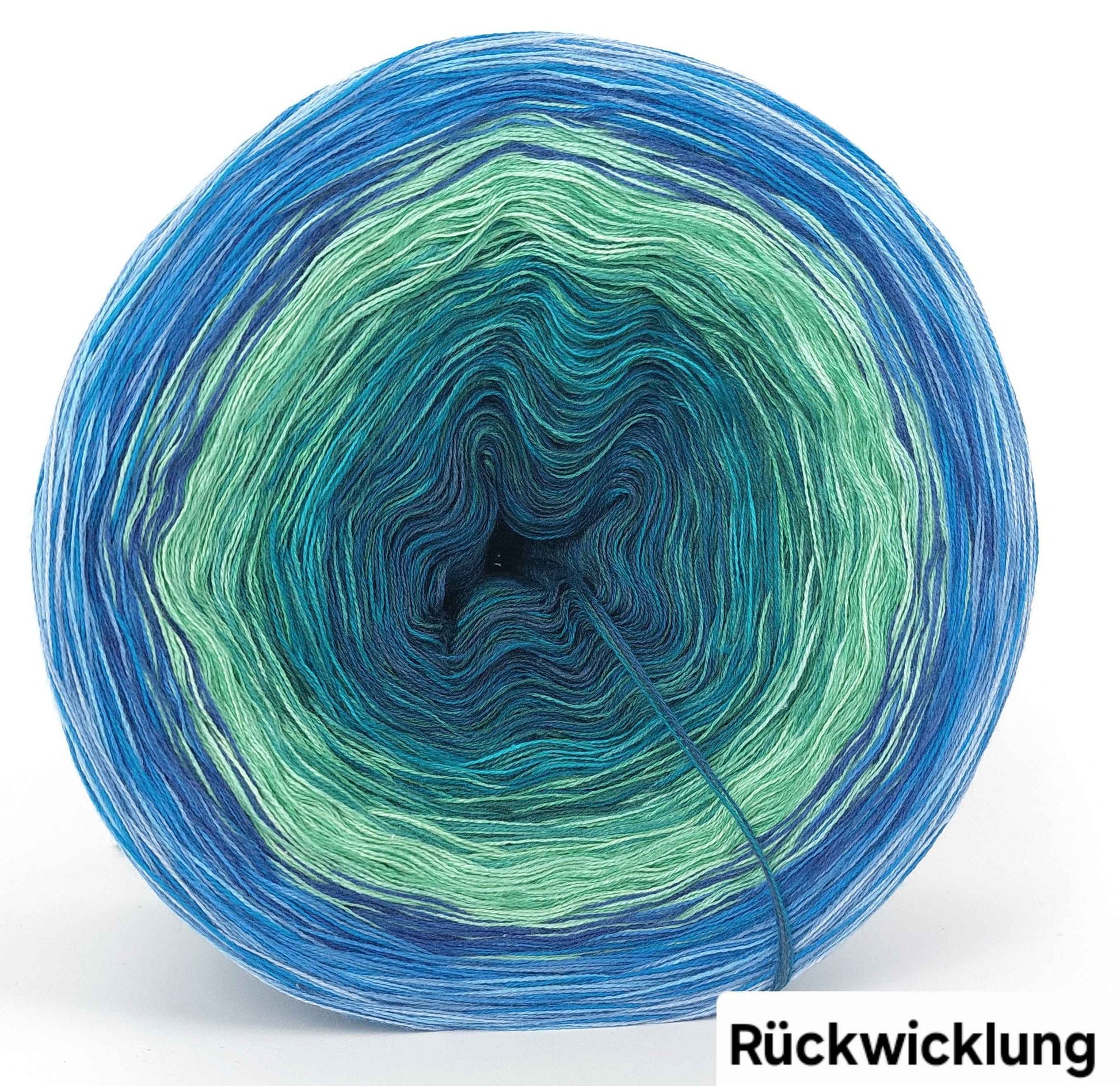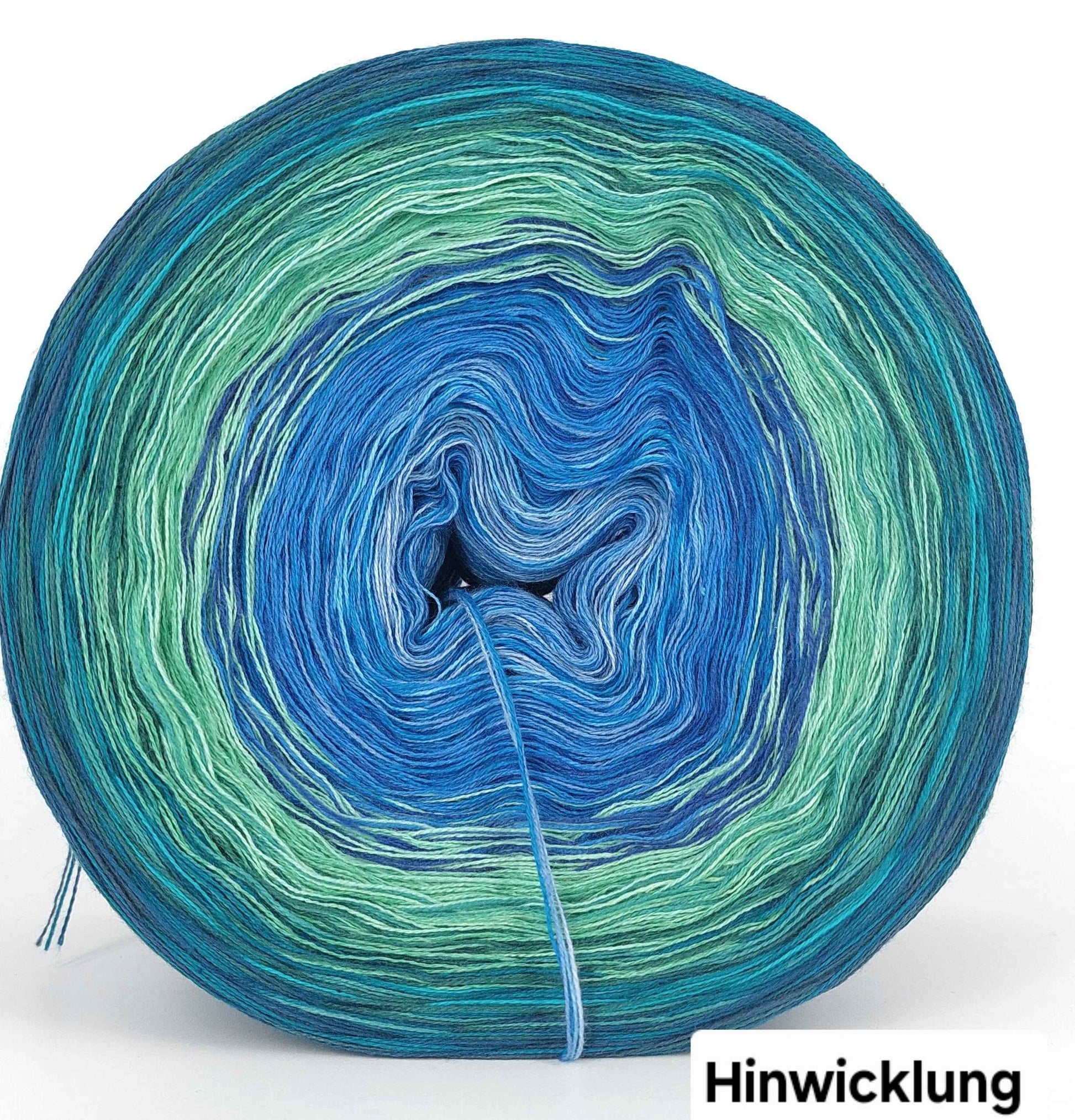 Bei der Tuchwicklung müsst ihr bei mir von innen beginnen. Hier wird jeder Farbabschnitt immer Länger, sodass die "Balken" im Tuch ungefähr gleich dick bleiben. Bei einer Normalen Wicklung sind alle Farbabschnitte gleichlang.